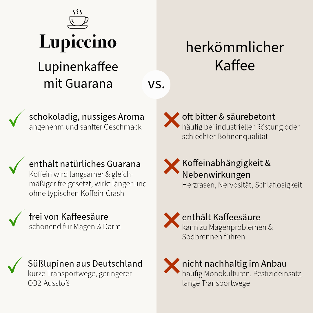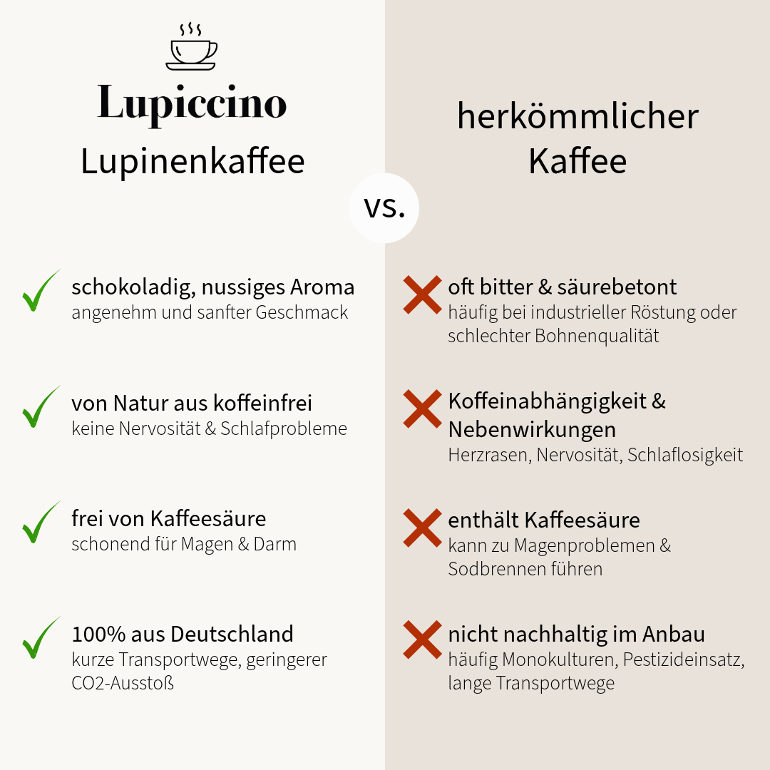 Im direkten Vergleich zu Kaffee schmeckt Lupinenkaffee milder, da er weder Kaffeesäure noch Bitterstoffe enthält.Viele Kundinnen und Kunden, die ausschließlich ihren Kaffee mit Milch oder Milchalternativen trinken, berichteten uns daher, dass sie Lupiccino sogar schwarz und ohne Zusätze genießen können ☺️