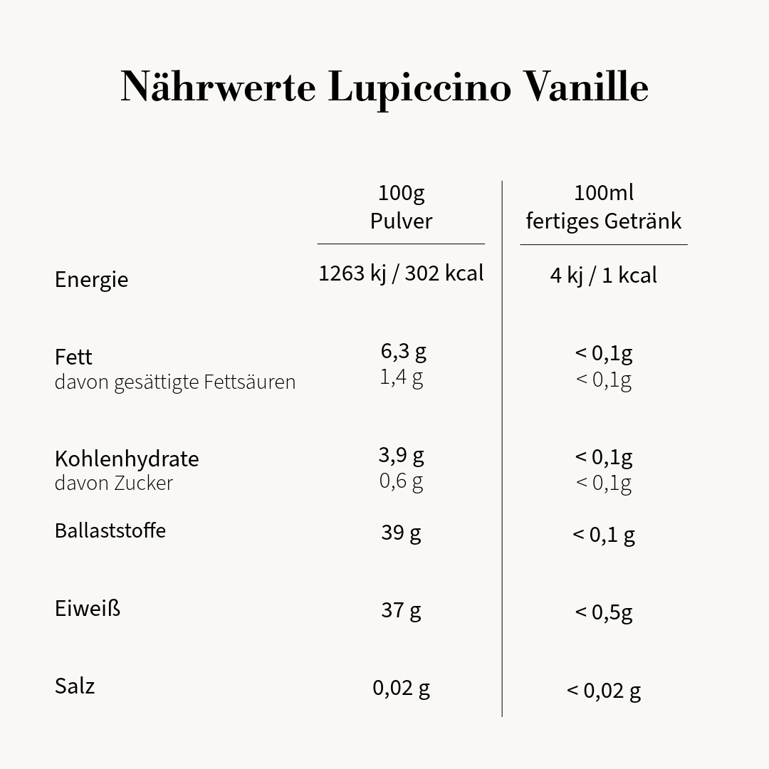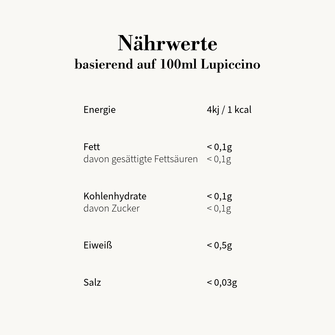 Die Makronährstoffe, wie auch die Proteine bleiben beim Brühvorgang im Satz hängen, sodass lediglich die enthaltenen Mikronährstoffe noch im Getränk nachweisbar sind. Du findest eine ausführlichere Nährwerttabelle in den Produktfotos von unserem Lupiccino Lupinenkaffee.