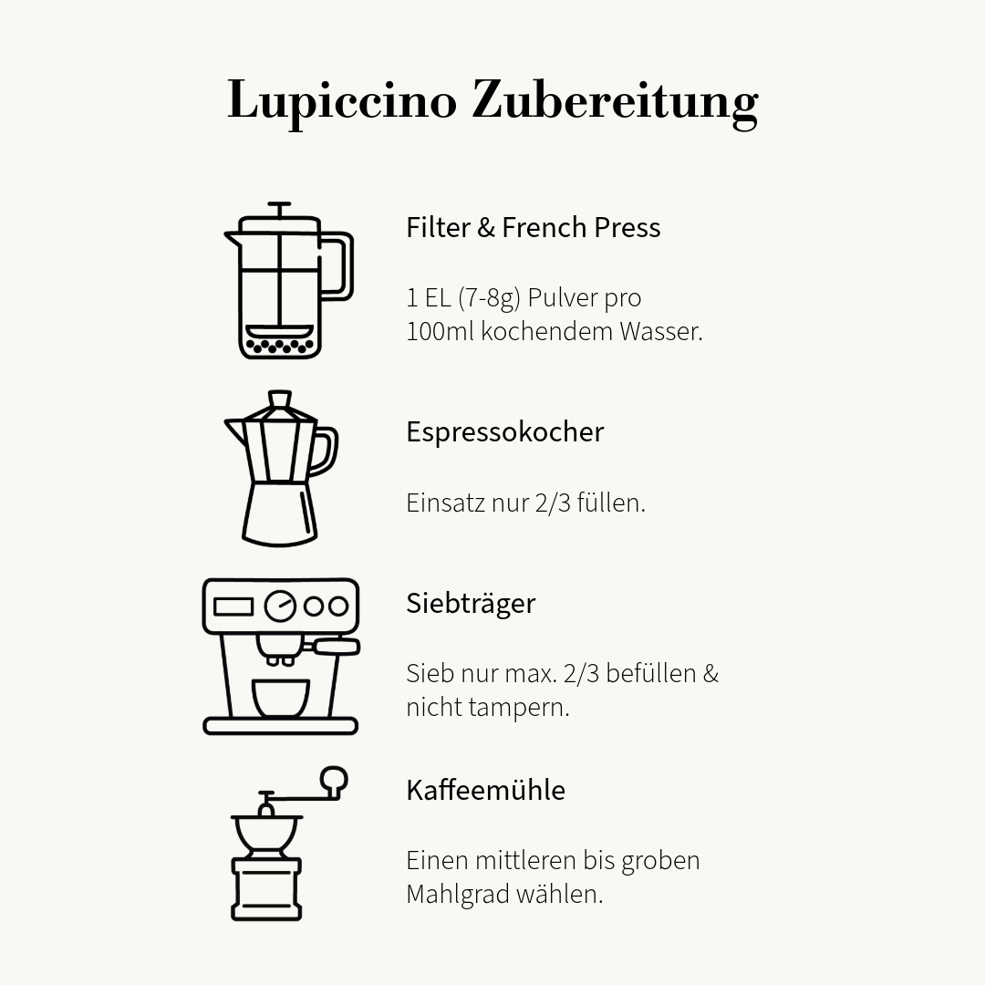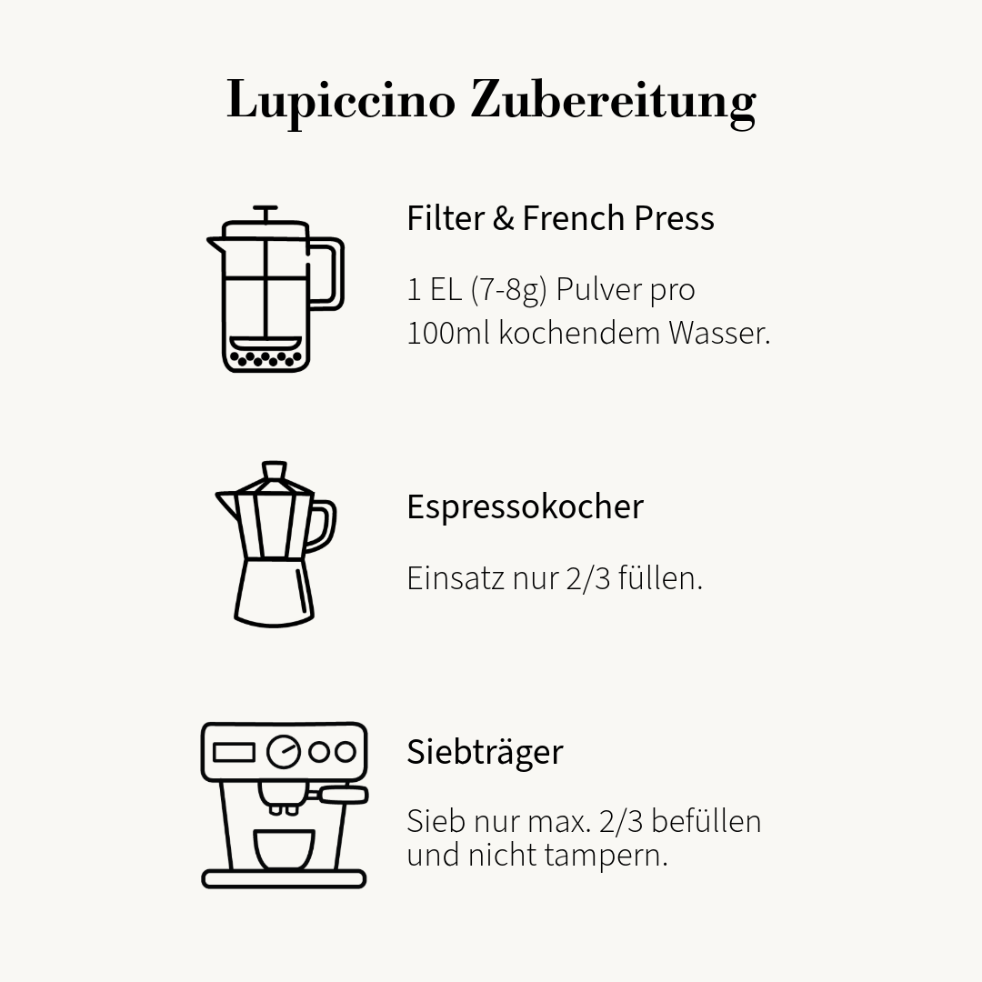 Wir empfehlen die sehr unkomplizierte Zubereitung in der French Press und im Kaffeefilter. Für den Espressokocher und die Siebträgermaschine ist Lupiccino aber genauso gut geeignet.