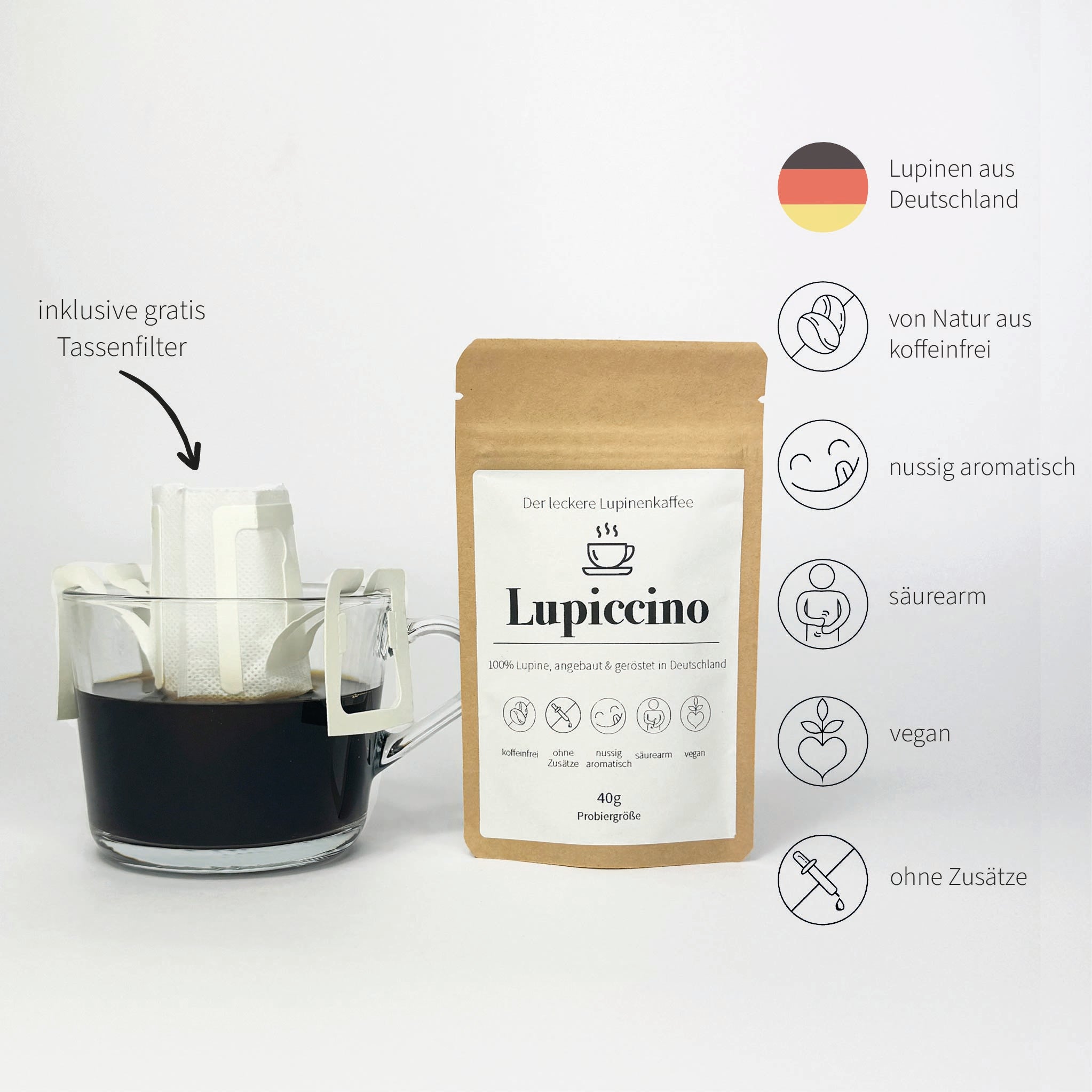 Im direkten Vergleich zu Kaffee schmeckt Lupinenkaffee milder, da er weder Kaffeesäure noch Bitterstoffe enthält.Viele Kundinnen und Kunden, die ausschließlich ihren Kaffee mit Milch oder Milchalternativen trinken, berichteten uns daher, dass sie Lupiccino sogar schwarz und ohne Zusätze genießen können ☺️