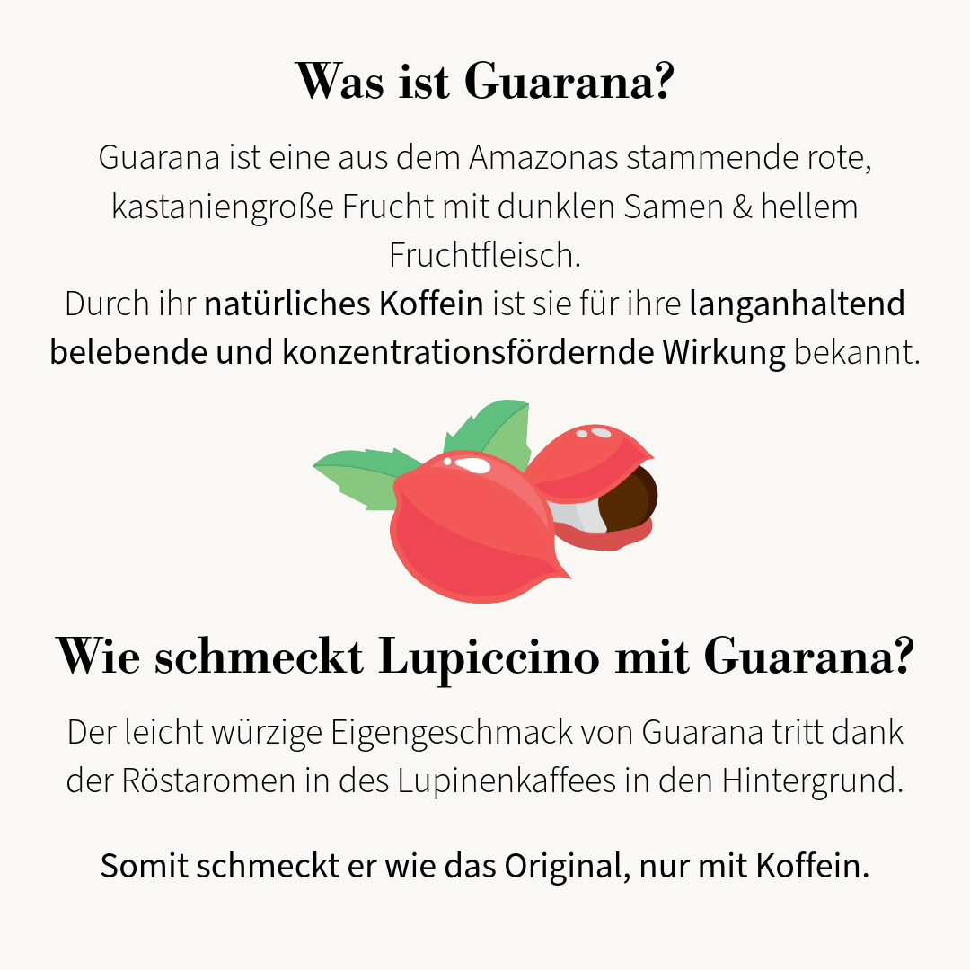 Guarana ist eine aus dem Amazonas stammende Pflanze mit natürlichem Koffein, die für ihre langanhaltende und belebende Wirkung bekannt ist. Anders als das Koffein von Kaffee, das schnell wirkt und mit Koffein-Crash endet, wirkt das Guarana in unserem Lupinenkaffee langsamer, aber deutlich länger und wohltuender.