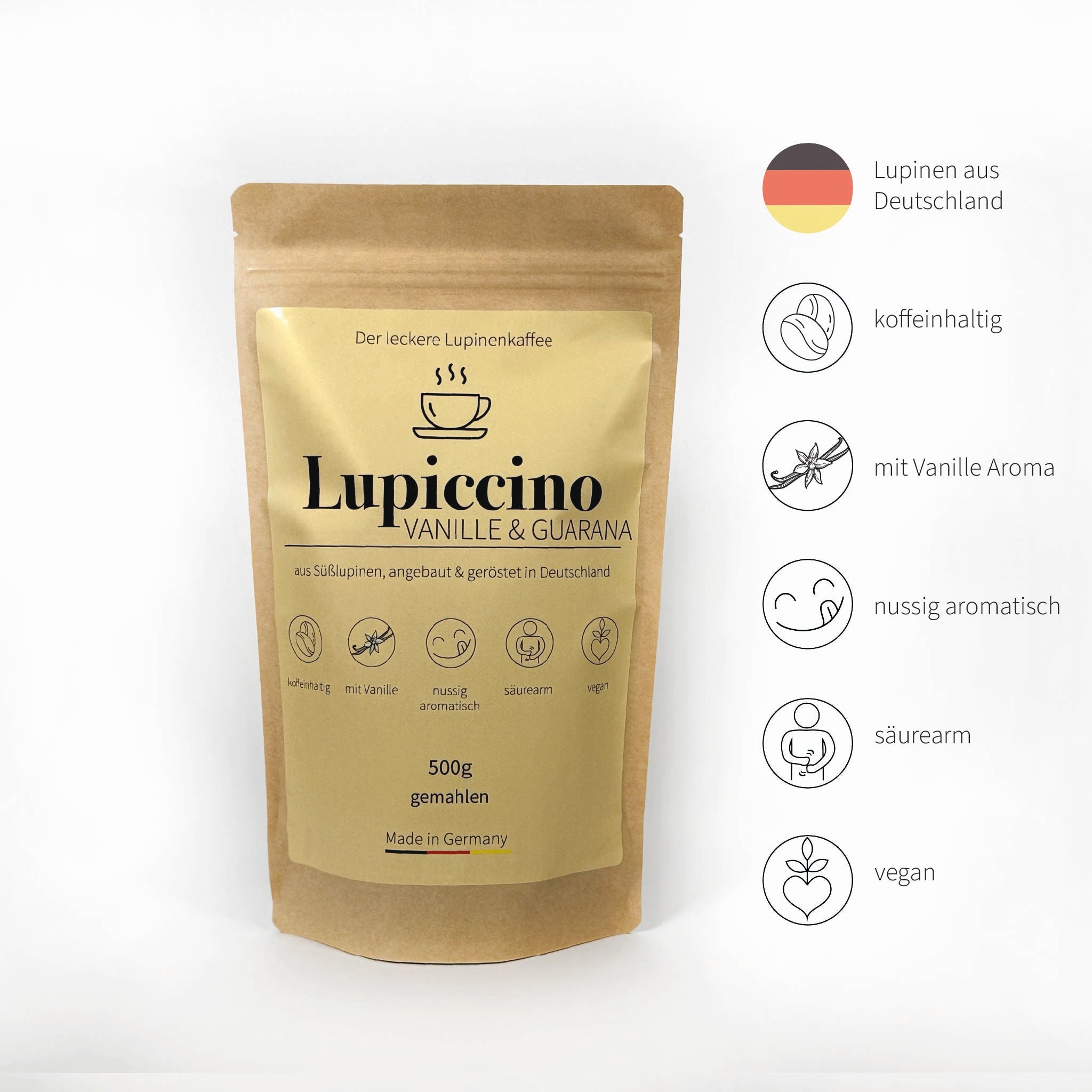 Entdecke unseren köstlichen Lupiccino Lupinenkaffee! Hergestellt in Deutschland aus den Samen der Süßlupinenpflanze, bietet er einen milden, vollmundigen Geschmack mit einer leicht nussig-schokoladigen Note und einem feinen Vanille Aroma. Die koffeinhaltige Kaffeealternative mit hochwertigem Guarana eignet sich perfekt für Kaffeeliebhaber, die auf eine angenehm belebende Wirkung ohne Koffein-Crash nicht verzichten wollen.
