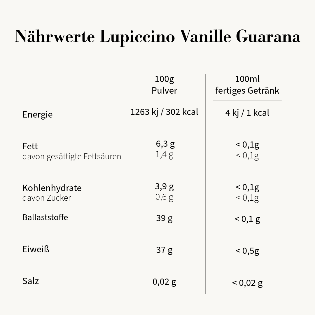 Lupinen (gemahlen & geröstet), Guaranasamenpulver (5%), natürliches Aroma (2%)