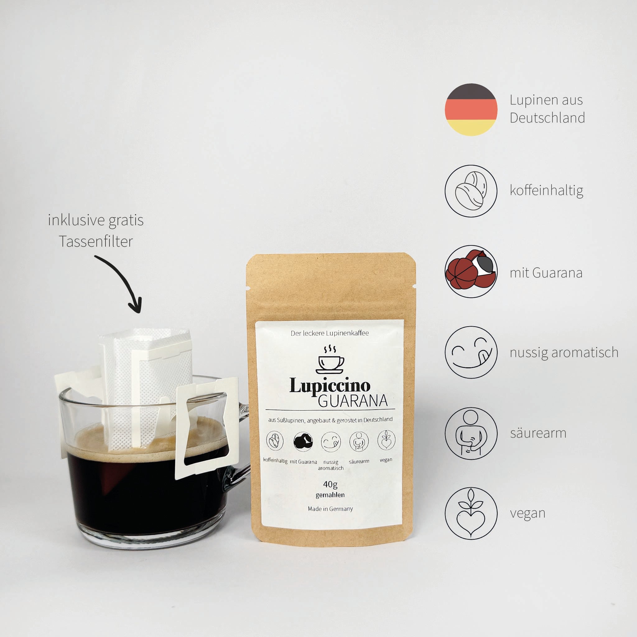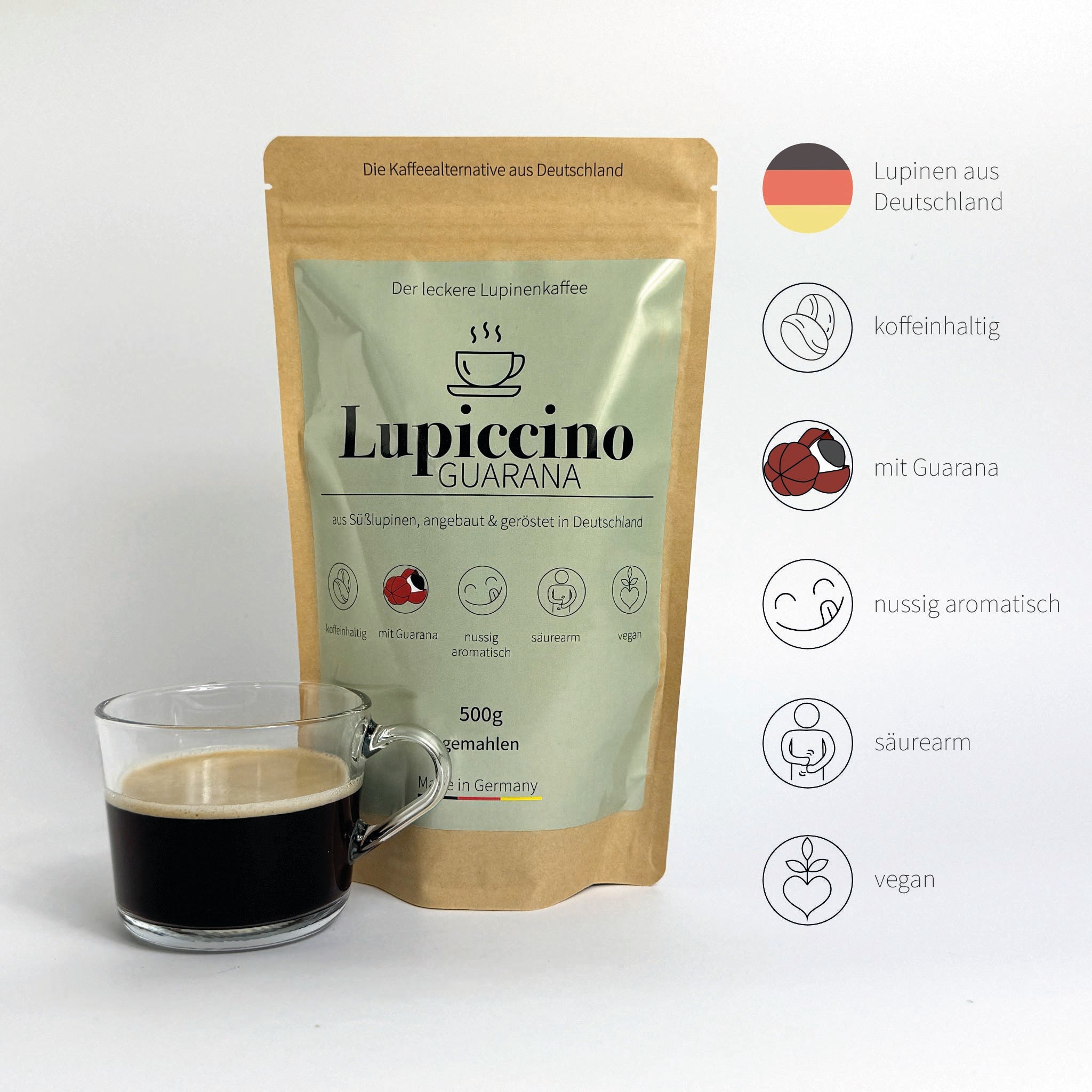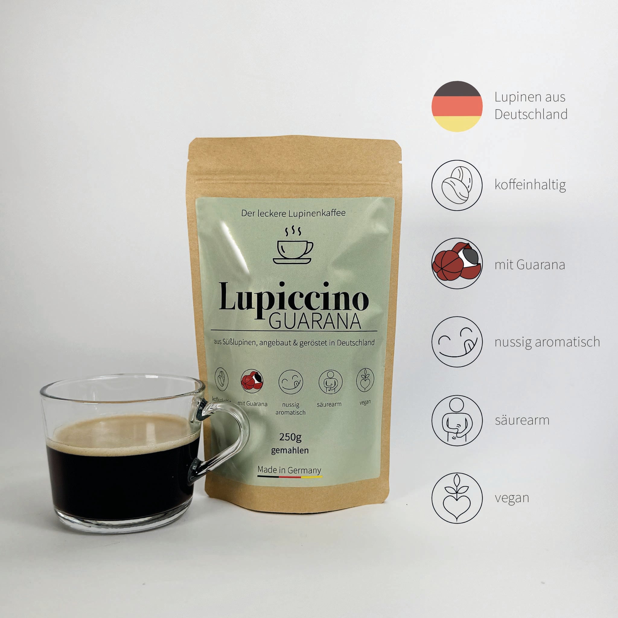 Entdecke unseren köstlichen Lupiccino Lupinenkaffee! Hergestellt in Deutschland aus den Samen der Süßlupinenpflanze, bietet er einen milden, vollmundigen Geschmack mit einer leicht nussig-schokoladigen Note. Die koffeinhaltige Kaffeealternative mit hochwertigem Guarana eignet sich perfekt für Kaffeeliebhaber, die auf eine angenehm belebende Wirkung, ohne Koffein-Crash nicht verzichten wollen.