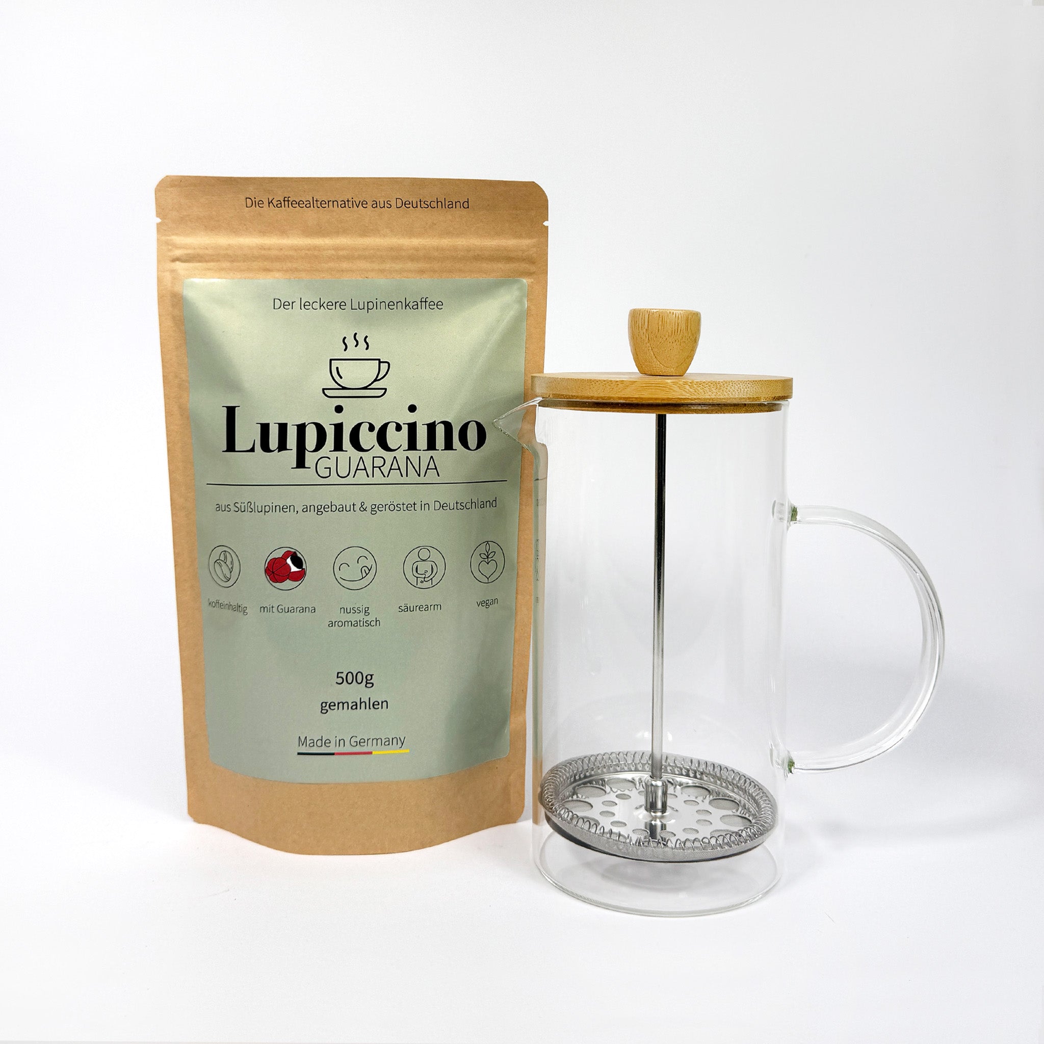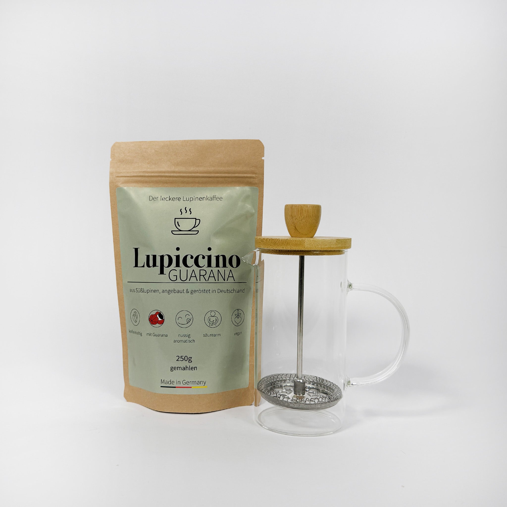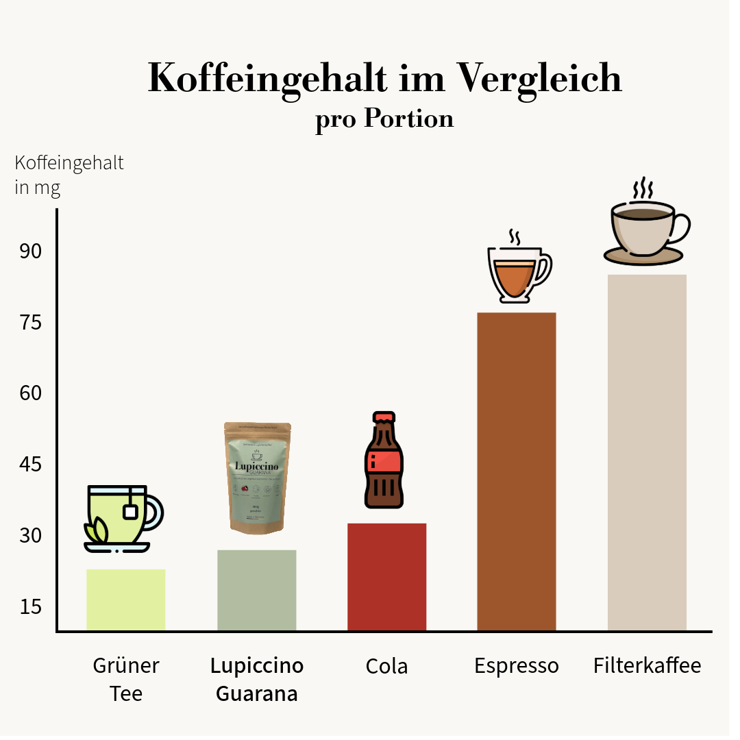 Entdecke unseren köstlichen Lupiccino Lupinenkaffee! Hergestellt in Deutschland aus den Samen der Süßlupinenpflanze, bietet er einen milden, vollmundigen Geschmack mit einer leicht nussig-schokoladigen Note. Die koffeinhaltige Kaffeealternative mit hochwertigem Guarana eignet sich perfekt für Kaffeeliebhaber, die auf eine angenehm belebende Wirkung, ohne Koffein-Crash nicht verzichten wollen.